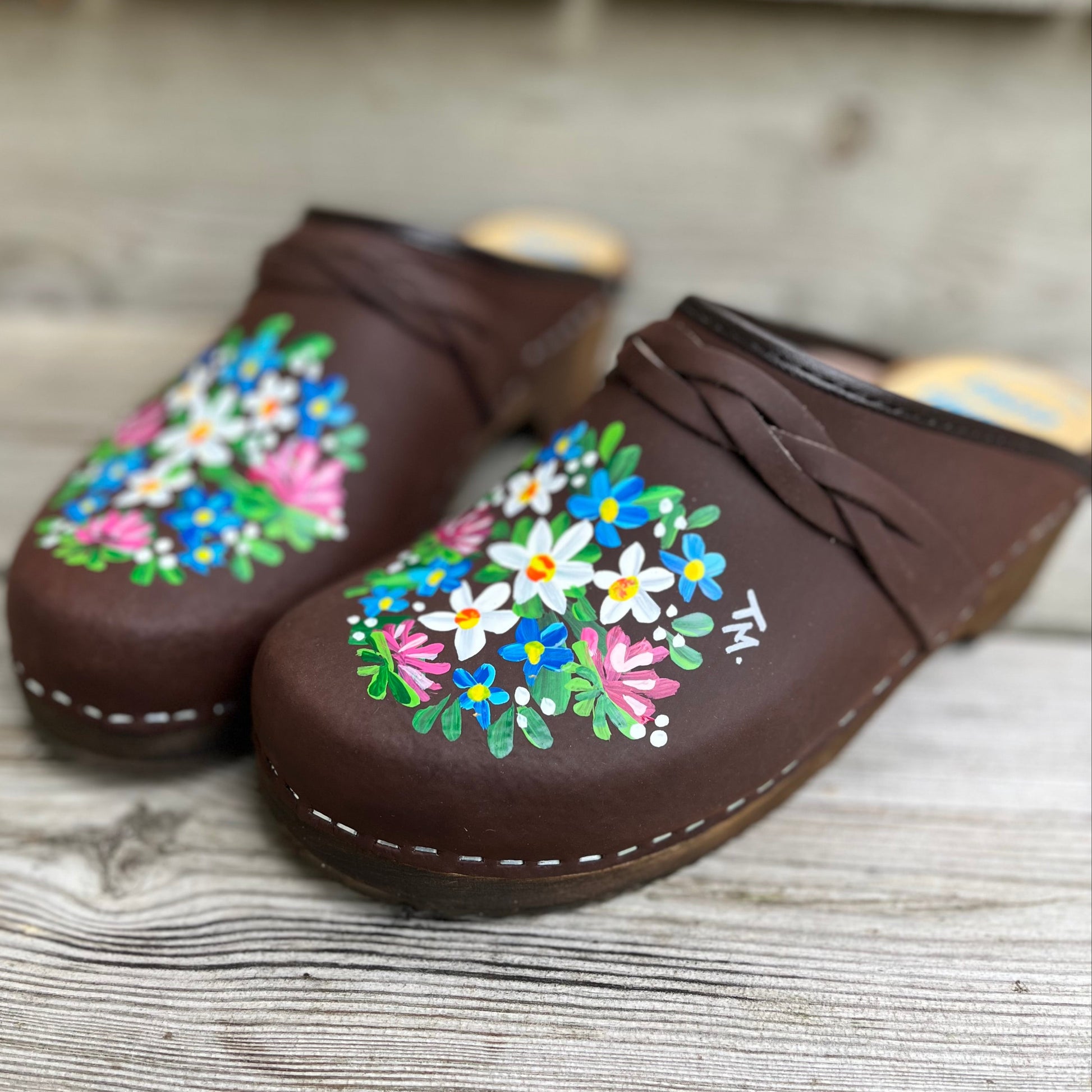 Handmålade träskor i brunt oljat läder med flätad rem. Brun träbotten. Blommor med inspiration från alperna.