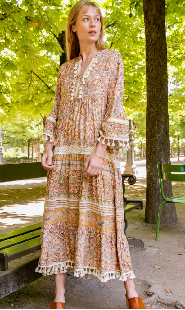Long bohemian print dress with tassels and lace. 100% viscose.