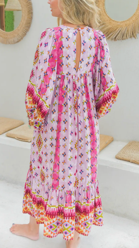 The definition of a go with any thing dress, perfect for any occasion. Featuring gorgeous exclusive prints. Sweet long sleeves with balloon hem and elastic cuff. Perfect length to wear clogs.100% viscose