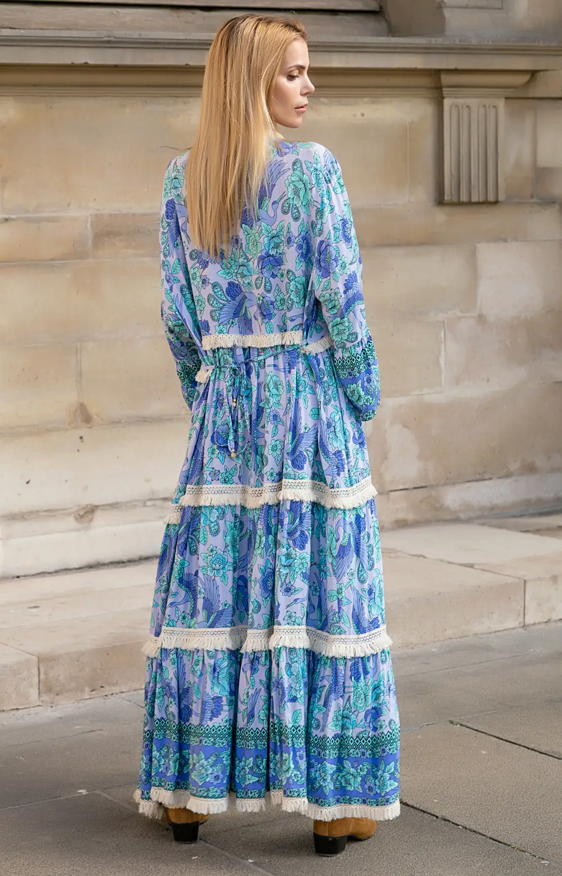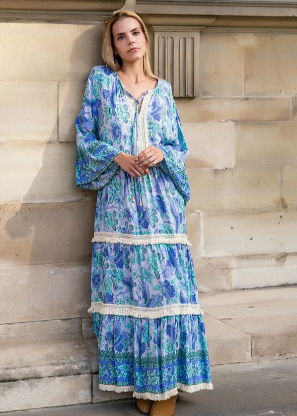 Blue Loose-fitting printed lace dress with flared sleeves. 100% viscose.