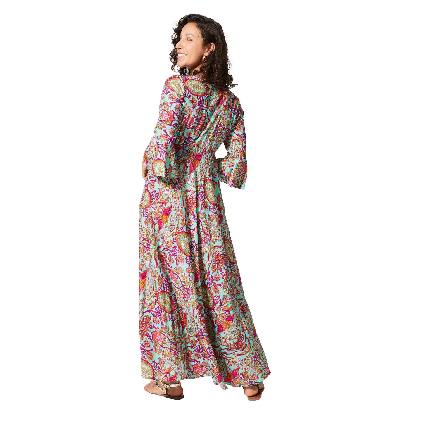 Washing: washing machine 30°C. Color (s): gold, pink, turquoise. sleeves: 3/4 sleeves, with ruffles. V-neck: wrap. Closure: elastic waist. FR size correspondence: S/M - L/XL (36/38 - 40/42).