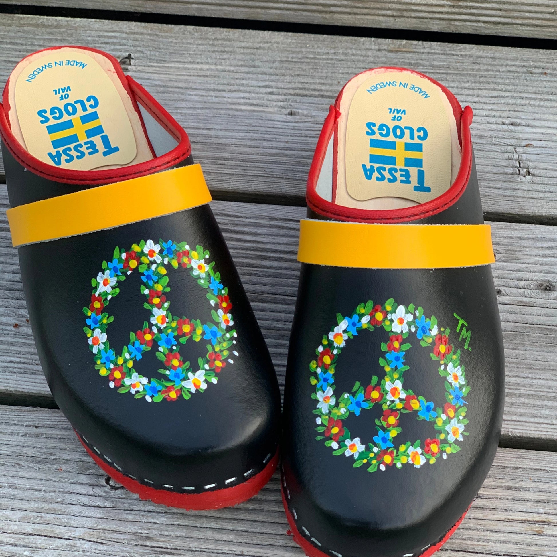 Klassisk trätoffel med peace tecken - en klassiker på Falsterbo näset. Gåsa clogs. Handmålade i Ljunghusen.