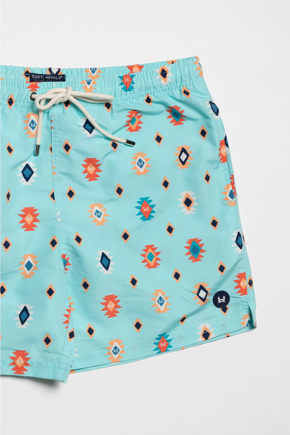 Boy's swim shorts with ethnic print in turquoise color. Made of 100% polyester. Regular fit. Mesh lining. Elastic waistband with drawstring. Side pockets and back pocket with flap.